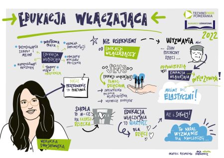 Notatka wizualna przygotowana przez Annę Staśkiewicz do wystąpienia Weroniki Dwojakowskiej o edukacji właczającej: